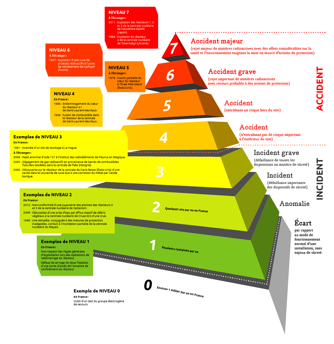 L’échelle internationale des évènements nucléaires (INES) permet de caractériser ce type d’évènements. Ceux de niveaux 1 à 3 sans conséquence significative sur la population et l’environnement sont qualifiés d’incidents.